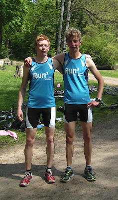 der 7,7km Crosslauf. Chrissi warf seinen Fahrradhelm mit etwa einer Minute Vorsprung auf seinen Wechselplatz. Zwischen uns drei, vier